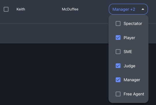 <table data-view="cards"><thead><tr><th>Role</th><th data-type="checkbox">View event</th><th data-type="checkbox">Play in event</th><th data-type="checkbox">Judge event</th><th data-type="checkbox">Manage event &#x26; teams</th></tr></thead><tbody><tr><td>Manager</td><td>true</td><td>false</td><td>false</td><td>true</td></tr><tr><td>Judge</td><td>true</td><td>false</td><td>true</td><td>false</td></tr><tr><td>Player</td><td>true</td><td>true</td><td>false</td><td>false</td></tr><tr><td>Spectator</td><td>true</td><td>false</td><td>false</td><td>false</td></tr><tr><td>SME *</td><td>true</td><td>false</td><td>false</td><td>false</td></tr><tr><td>Free Agent *</td><td>true</td><td>true</td><td>false</td><td>false</td></tr></tbody></table>