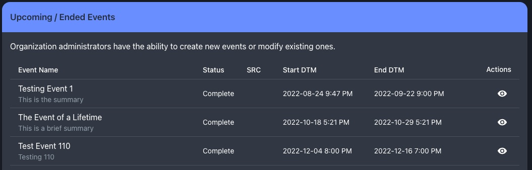 To see a list of planned, completed, and currently-running events, navigate to the **Organization->Events** menu.