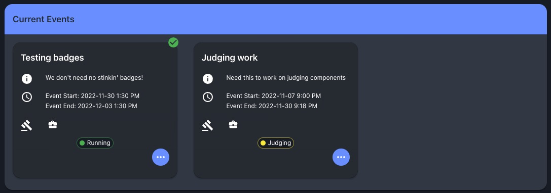 Joining an event will present a green checkbox in the upper-right corner of the event box. This will be selected as your "Current Active Event" and affect what is displayed in the dashboard for teams, event times, and scores.