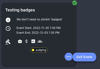 Current events are those that are in a Running or Judging state. If your user has been added as a participant in one of these events, you can choose to Join or Exit from the ![](https://3721606527-files.gitbook.io/~/files/v0/b/gitbook-x-prod.appspot.com/o/spaces%2F6mkOwjZ72rd8zsuXFYXG%2Fuploads%2FxDf88iUfaMTqE3o8tMDF%2Fimage.png?alt=media\&token=32eb9194-41e8-4d57-8f9e-3ad2000c9a12) menu.